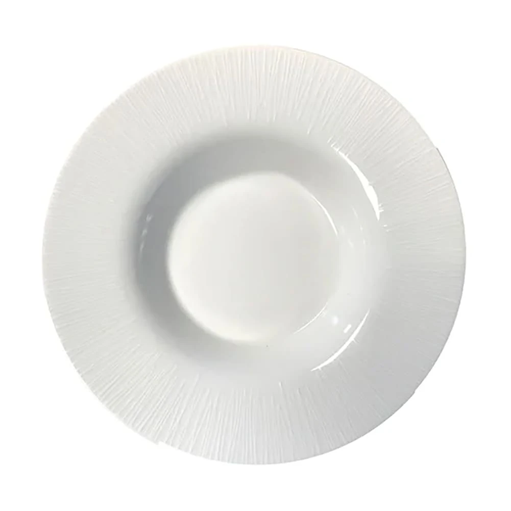 Emanata is a contemporary, white-on-white decor on Bauscher’s Noble China and is named for the expressive lines in comics showing a character’s mood or state. Radiating incised lines embellish the rim of plates, saucers, and mugs in a subtle yet distinct pattern.