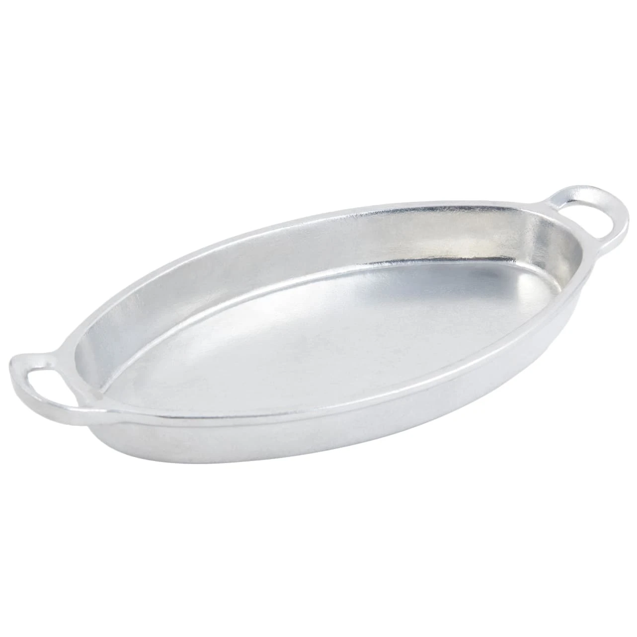 This Bon Chef Pewter Glo Oval Fish Platter has a 24 Oz. capacity and is a 12.5″ x 6.25″ size. It is made from aluminum, and includes a lifetime body guarantee against breaking. It is also oven safe.