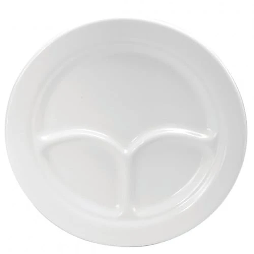 This 3 compartment plate is part of the Buffalo Cream White collection and features a twice fired, body with a reinforced edge. It is 9.5″ in diameter and perfect for use in cafeterias, schools or healthcare facilities. This plate includes a limited 3 year no‐chip warranty.