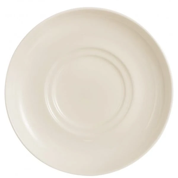 This Infinity 6″ bone china saucer fits the FN030 bouillon cup. Rimless and stackable, it is a favorite of upscale hotels and banquets.