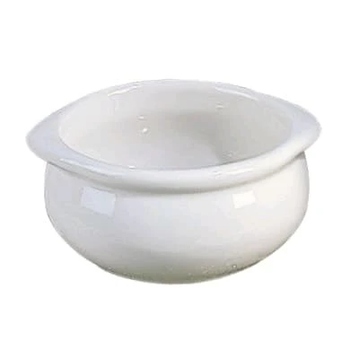 This white 10 ounce bowl is great for serving piping hot onion soup. We have a large selection of soup bowls to fit your every need. Our bowls are made of vitrified china, extremely durable and lead free.