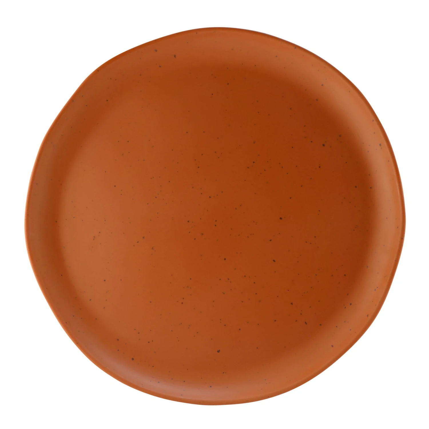 Add exotic flair to your table with this 14″ round plate from Elite Global Solutions®. It is part of the Moroccoâ„¢ Collection and features a sunburn terra cotta color with speckles and an organic shape. This plate is made from 100% premium melamine material and is extremely durable.