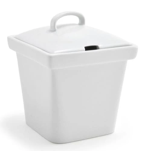 This Front Of The House® Mod® Pot has a 15 Ounce capacity and can be used on its own or paired with the Mod® Bamboo Holders (sold separately) to create unique buffet displays. It is made from white porcelain and has a modern linear design. Its lid is notched, allowing for the use of utensils.