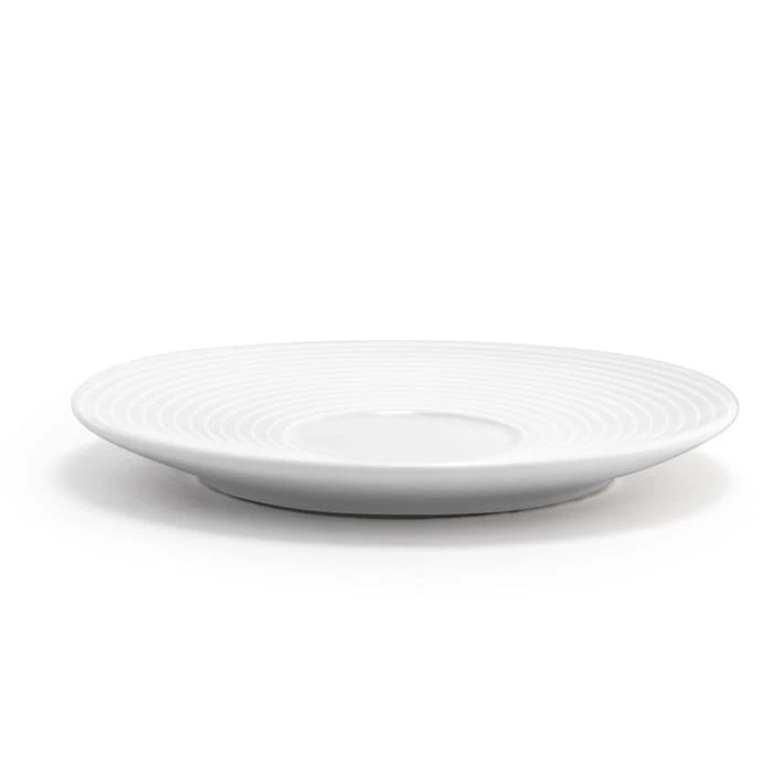 This Front Of The House® Spiral® Saucer can be used on its own or paired with the Spiral® 3 Ounce Cup, sold separately. It is made from porcelain and features a subtle linear design, adding a touch of sophistication to your table.