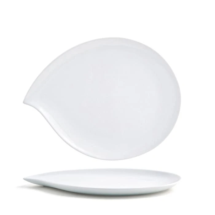 This Front Of The House® Plate features a unique teardrop shape. It is made from white porcelain and comes in a 12″ size, ideal for serving or displaying a variety of foods.