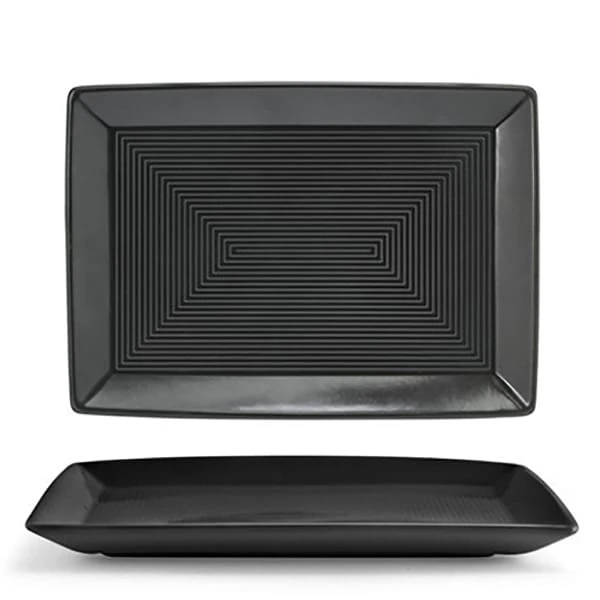 This Spiral black porcelain plate from FOH features a subtle, linear design that allows you to create sophisticated food presentations.