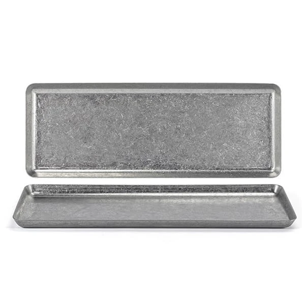 This Front Of The House® Mod® Plate is made from stainless steel in an antique finish. It has a modern design, combining new and old for a unique presentation.