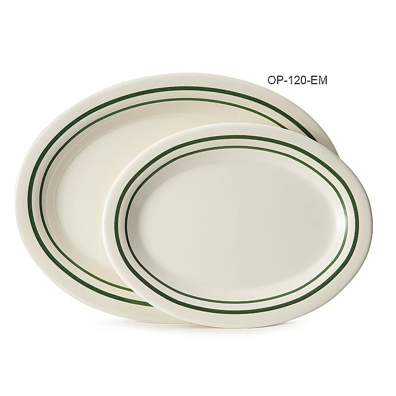 This 12″ x 9″ oval platter features the creamy white body and green striped rim of the Emeraldâ„¢ collection from G.E.T. Made of durable melamine so it is break resistant, dishwasher safe, and BPA free.