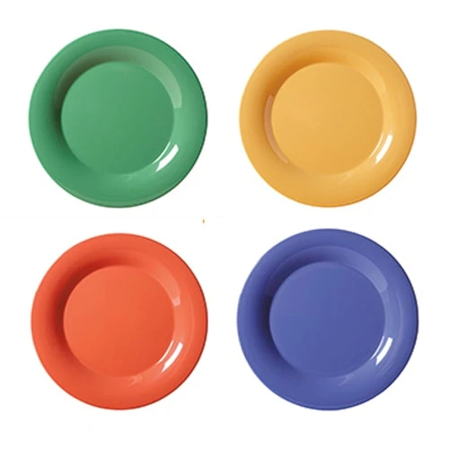 This pack of twelve Diamond Mardi Gras™ plates includes 3 of each color: Rainforest Green, Peacock Blue, Tropical Yellow, and Rio Orange. It is also commercial dishwasher safe.