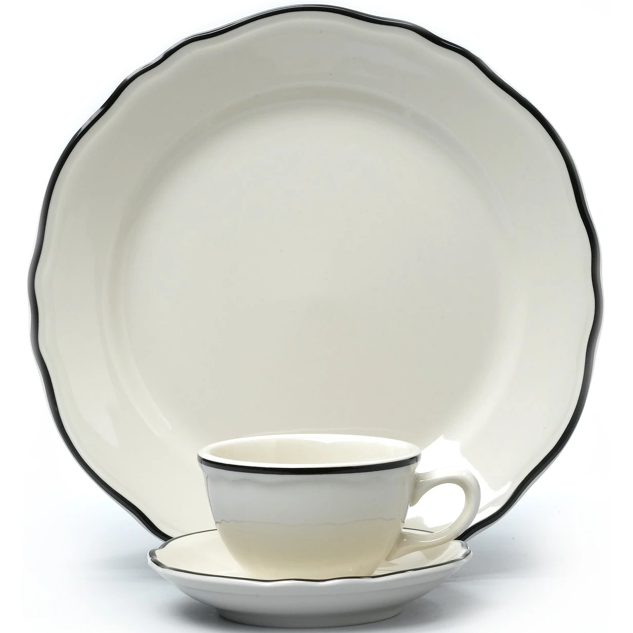 This 7.25 ounce bouillon cup features an ivory body with the scalloped edge of the Carolyn design and the black rim of the Styleline Black pattern.