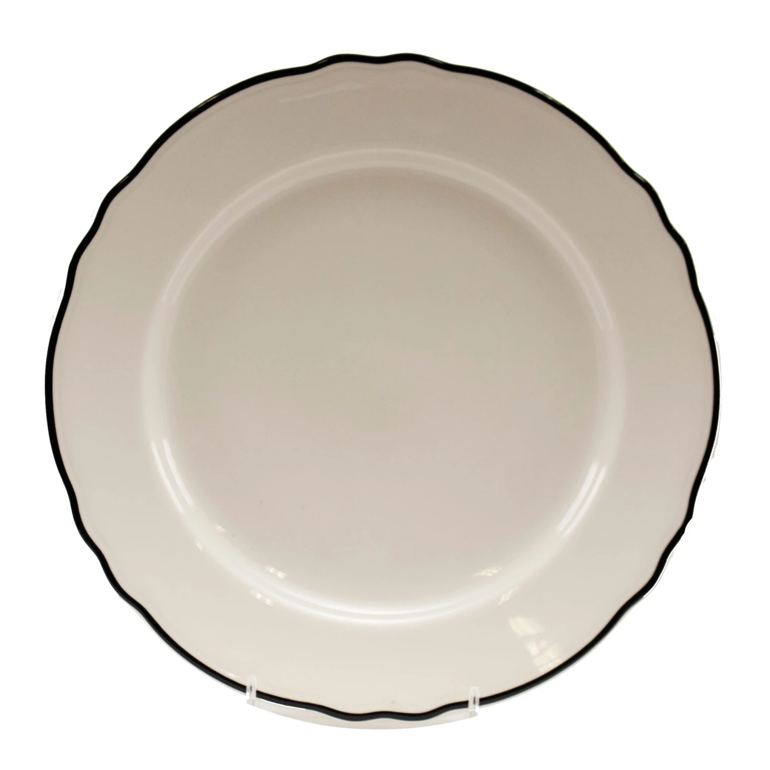 Go back in time with this retro style plate from Homer Laughlin. This ivory plate features the scalloped edge of the Carolyn design and the black rim of the Styleline Black pattern.