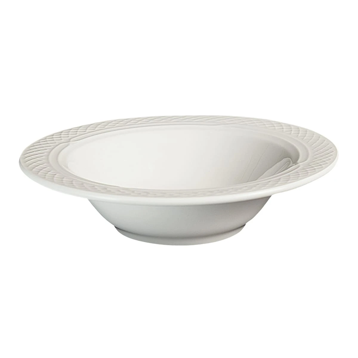 The 10 Oz Kensington™ grapefruit bowl transcends European elegance with the intricate white‐on‐white embossed lattice sculpting and detailed pointed‐arch pattern on a wide rim.