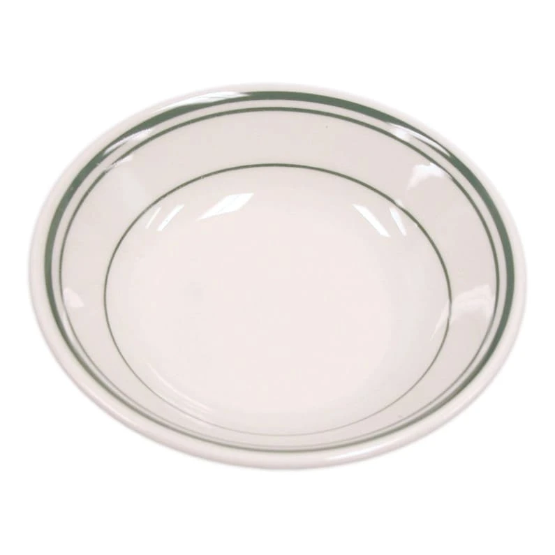 This 6 ounce fruit dish features an ivory body and a heavy duty rolled edge design with a wide rim and the green accent lines of the Green Band pattern.