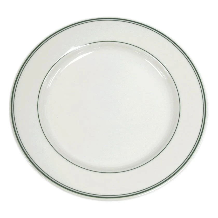 This 11″ plate features an ivory body and a heavy duty rolled edge design with a wide rim and the green accent lines of the Green Band pattern.