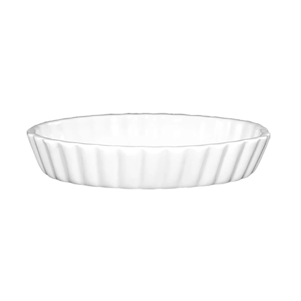 This European white creme brulee dish from International Tableware features vitrified stoneware construction and is oven safe up to 450°F.