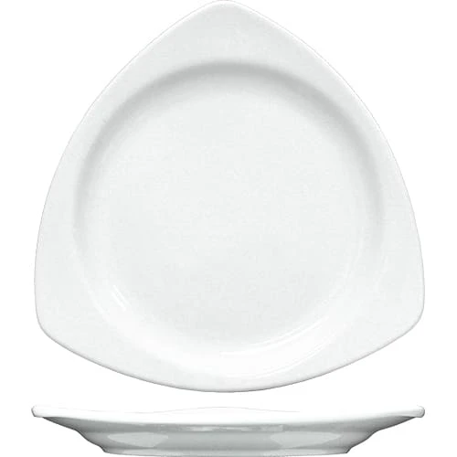 This European white plate has a triangular shape. Great for serving appetizers of desserts.
