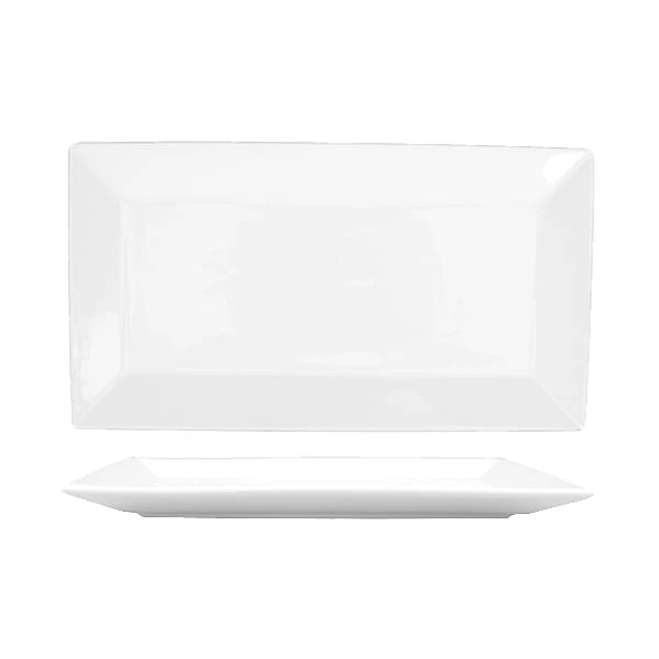 Add a modern look to your table with this 14.5″ x 8.25″ rectangular platter from International Tableware. It is part of the Slope! Collection and features beautiful bright white porcelain construction. Perfect for restaurants or banquet facilities.