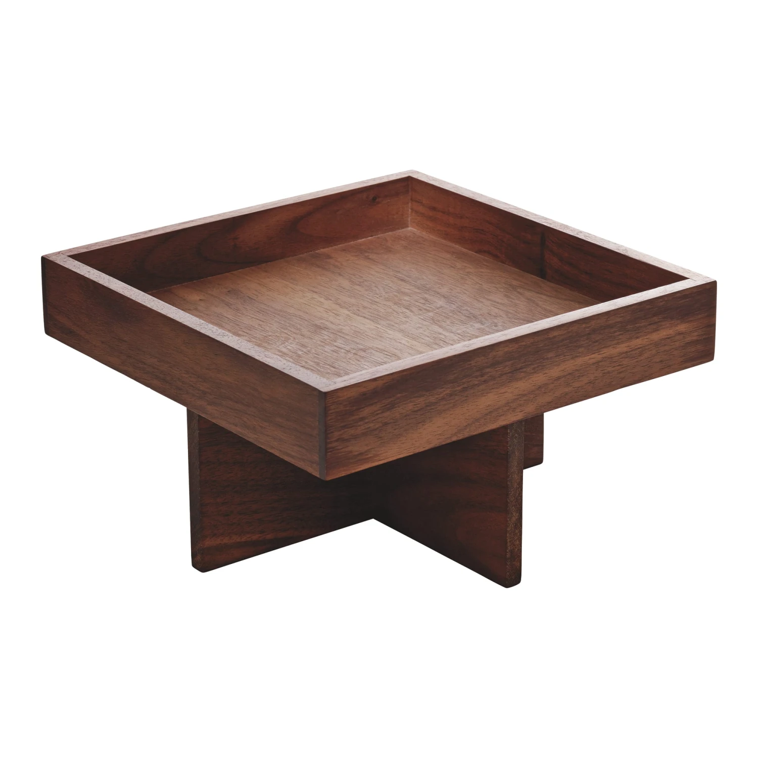 The Ananti collection from Schonwald has pieces in marble, wood, or leather. This walnut wood square wood stand adds an air of playfulness to your table.