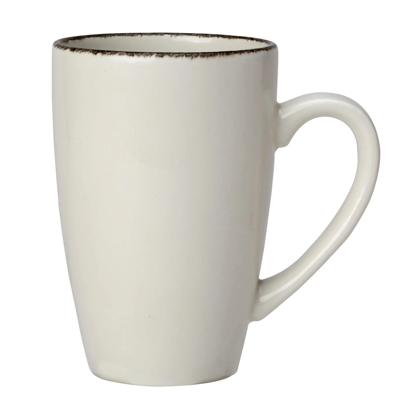Simple yet exciting, this Charcoal Dapple 10 ounce Quench mug features a soft white body and bold black rim add both a rustic and contemporary feel for your food service presentation.