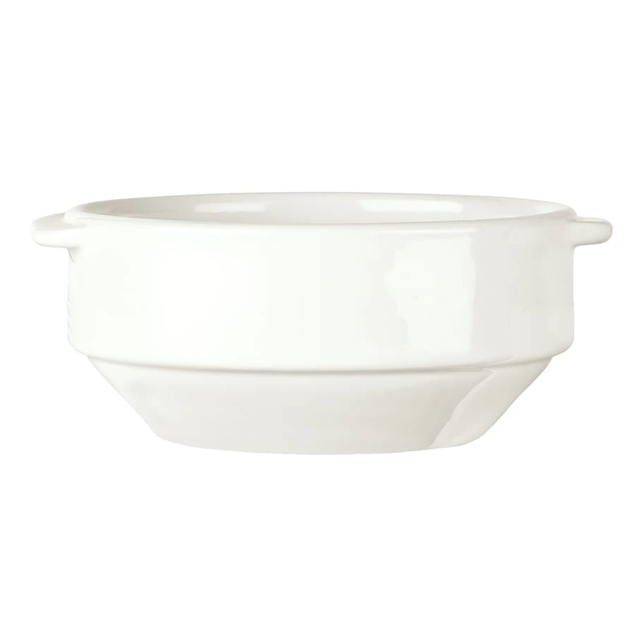 This Syracuse China Slenda soup cup has a 15 Ounce capacity and features two side handles. It is made from porcelain and comes in a royal rideau color.
