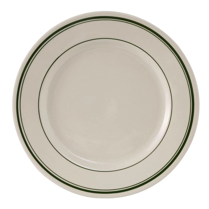 Serve appetizers or main entrees on this 8-3/8″ round plate from Tuxton®. It is American white/eggshell in color with green bands around the edge. Perfect for use in restaurants, diners, or buffets. This wide rim plate is microwave safe, dishwasher safe and oven proof. Don’t forget about the Lifetime Edge Chip Limited Warranty.
