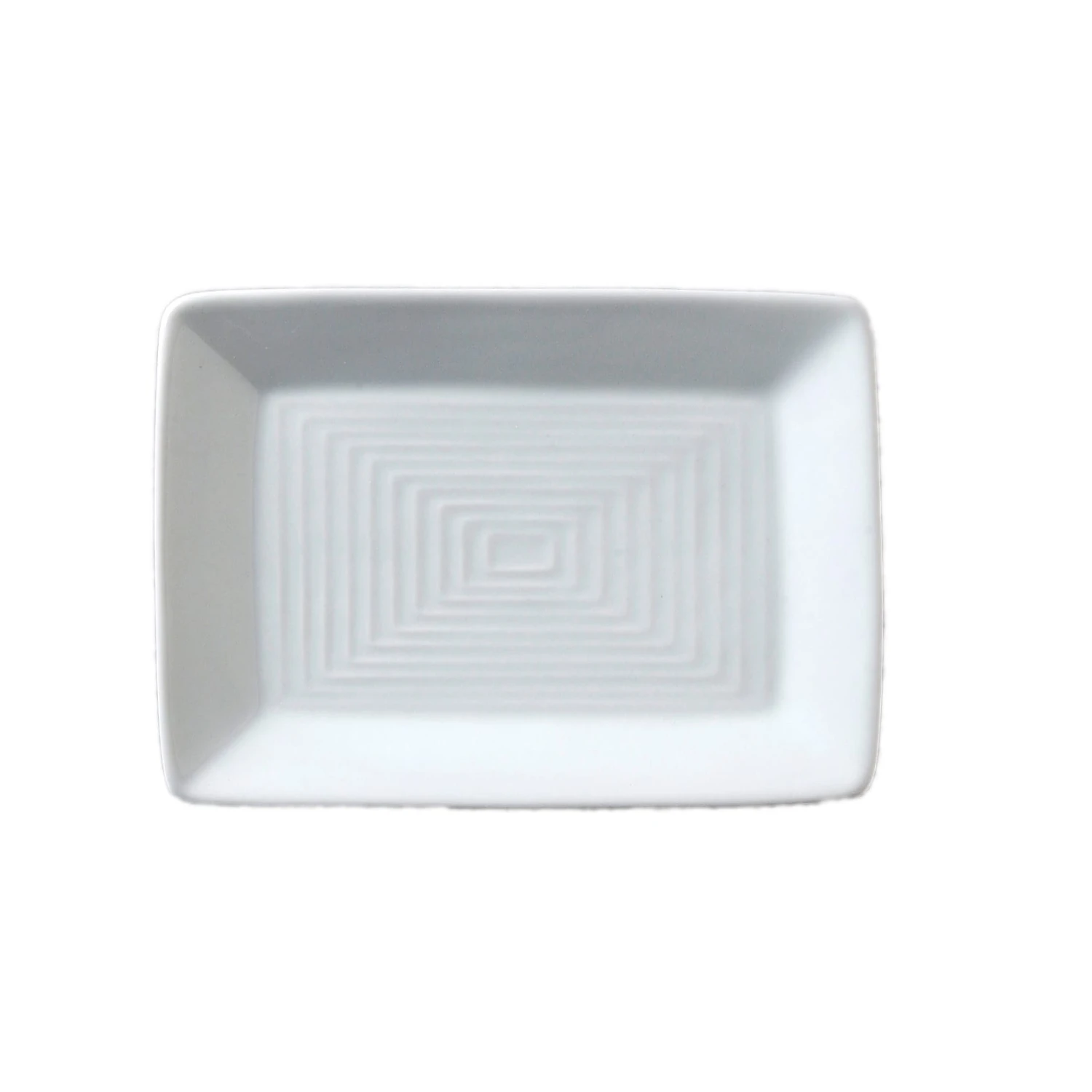 This rectangular plate continues the aesthetics of the Fusion design, with the added feature of an embossed center. This plate is a contemporary, bright white palette for displaying your culinary creations. The Signature collection is made from dishwasher and microwave safe porcelain.