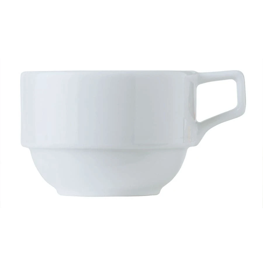 This 8.25 ounce stacking cup from World Tableware is part of the Empire Pattern and is perfect for casual and bistro style restaurants.; The Alpine white color gives it a crisp look.