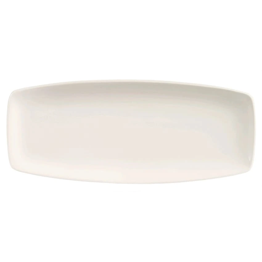 This World® Tableware Basics 14″ long tray is made from bright white porcelain. This long tray is lead free, fully vitrified, and has a polished foot that helps prevent plate to plate scratches.