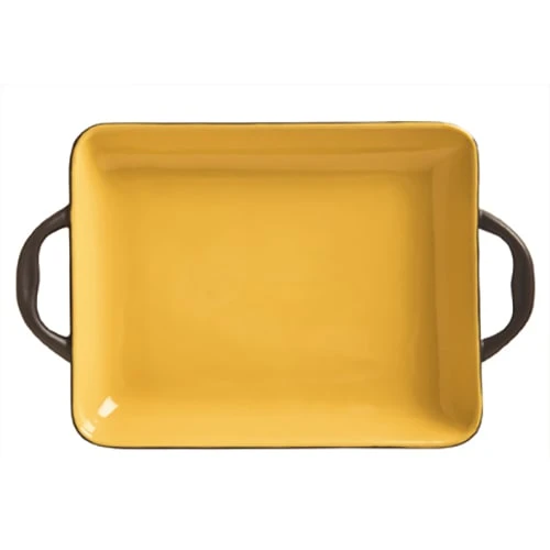 This beautiful handled tray from World® Tableware is part of the Coos Bay Collection and is heat resistant up to 350°F. This two toned rectangular tray features a butter yellow color on the inside and brown on the outside and handles. It has a capacity of 5.5 ounces and is perfect for adding a fresh‐from‐the‐oven appeal to appetizers and sides.