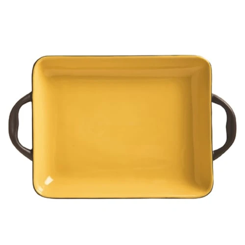 This beautiful handled tray from World® Tableware is part of the Coos Bay Collection and features a butter yellow color on the inside and a brown color on the outside and handles. This tray is heat resistant up to 350°F and is perfect for adding a fresh‐from‐the‐oven appeal to appetizers and sides.