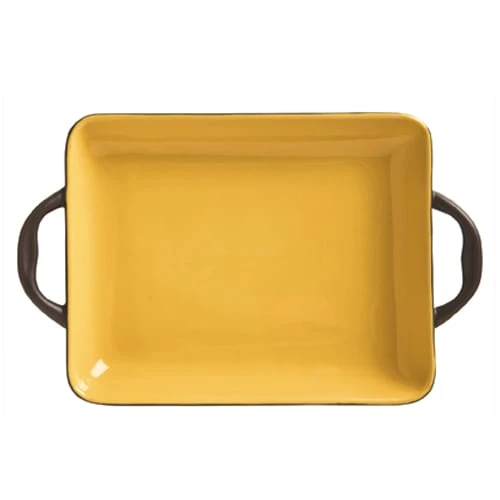 This 23 ounce rectangular tray from World® Tableware is part of the Coos Bay Collection and is heat resistant up to 350°F. This two toned tray features a butter yellow color on the inside and brown on the outside and handles. It is perfect for adding a fresh‐from‐the‐oven appeal to appetizers and sides.