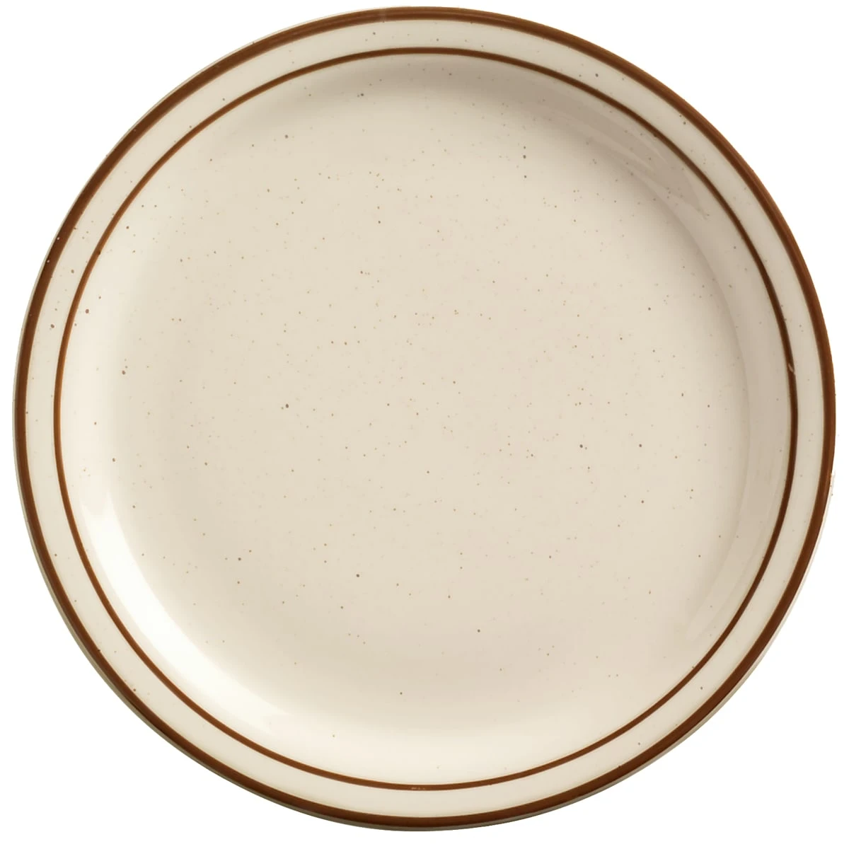 This 10‐1/2″ narrow rim plate features a cream white body with the brown bands and speckles of the Desert Sand pattern. It is a cost effective choice for your restaurant.