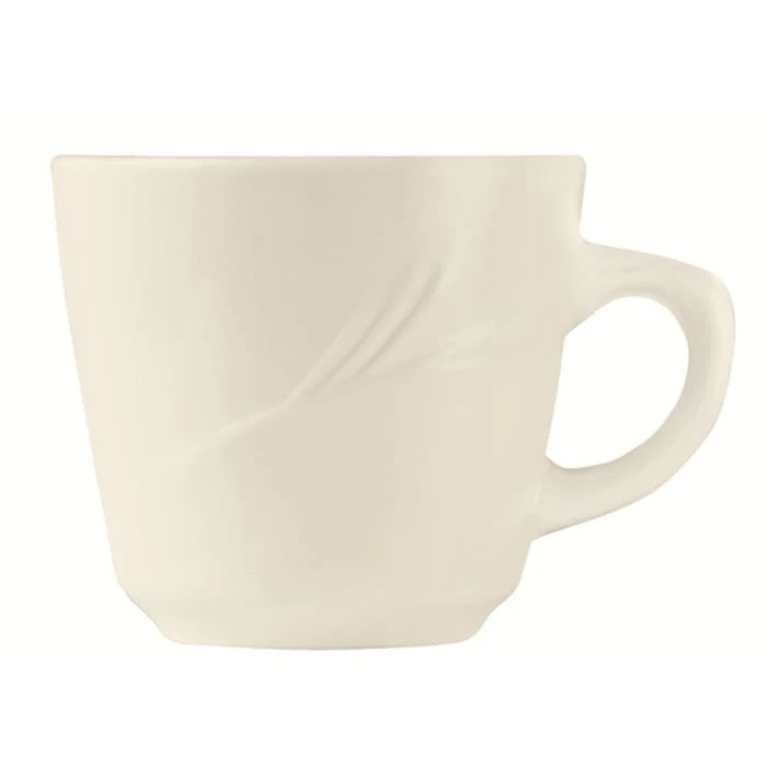 This tall 7 ounce cup pairs perfectly with the END‐15 saucer. This tall, 7 ounce mug features a cream white porcelain body and the fanned accent lines of the Endurance collection.