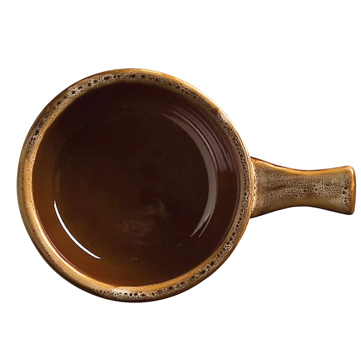 This 12 ounce onion soup crock features a caramel and beige body and a long handle.
