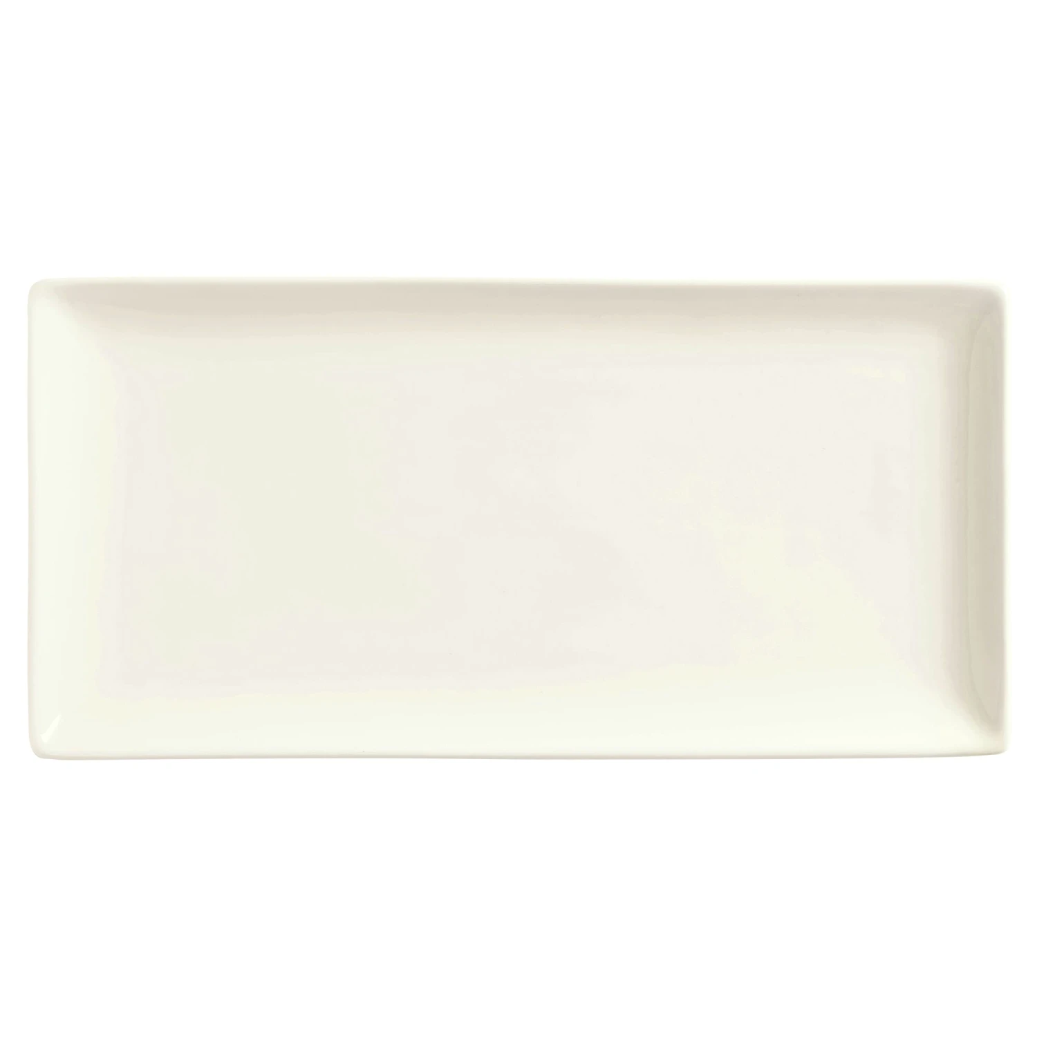 This World® Tableware Slate coupe tray can be used to serve appetizers, desserts, and specialty meals. It is a 16‐1/4″ x 5‐1/2″ size and comes in an ultra bright white color.