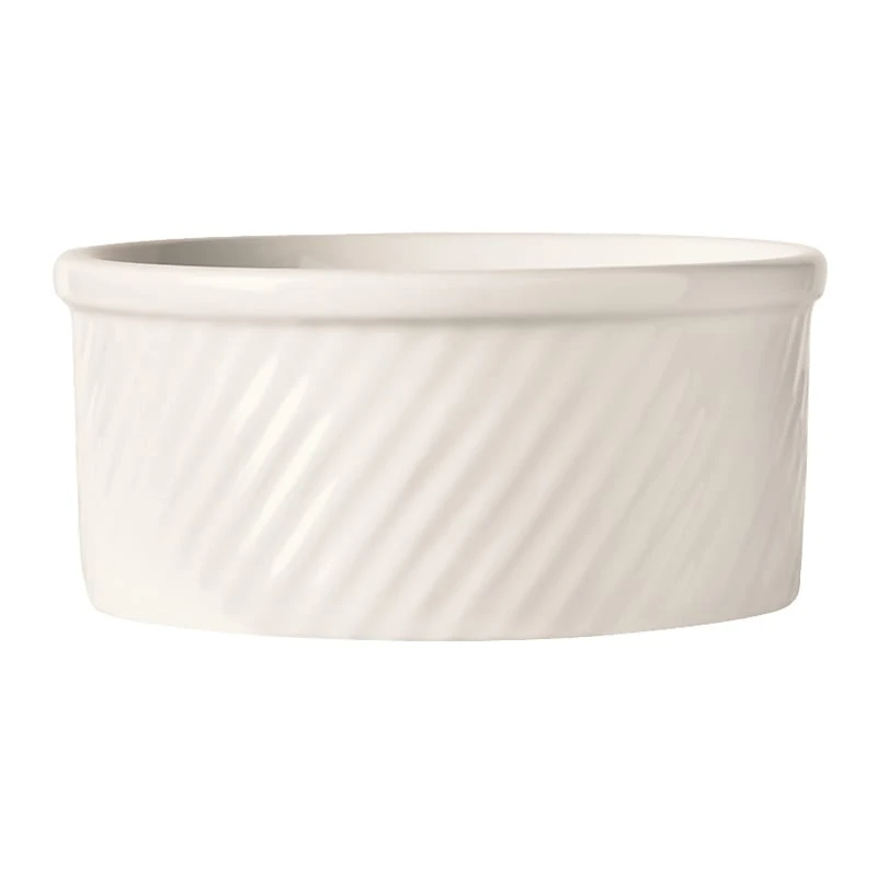 This 8 ounce, 2″ x 4.13″ round souffle dish features diagonal fluted lines on the outside in Bright White from the Bedrock Ovenware design.